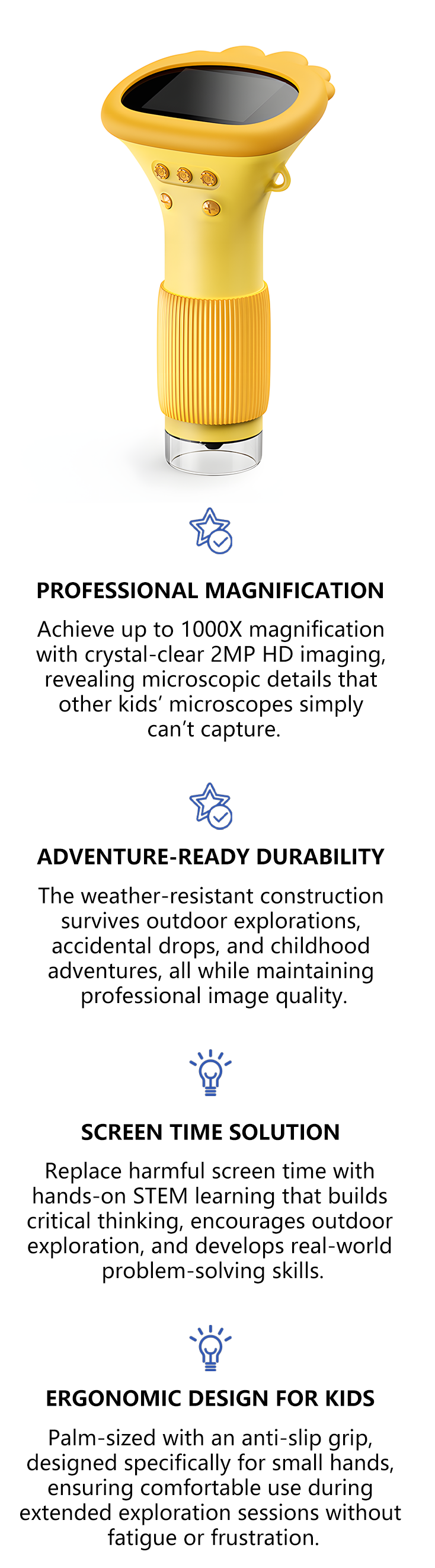 - 1000x magnification with 2MP resolution – Clearly reveals microscopic details, helping kids truly understand the hidden world.