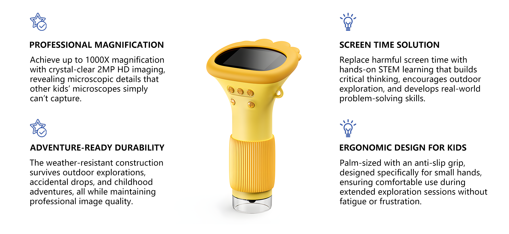 The Klynn Kids' Digital Microscope redefines your child's scientific exploration, utilizing two core technologies to deliver unprecedented clarity and visual impact:
