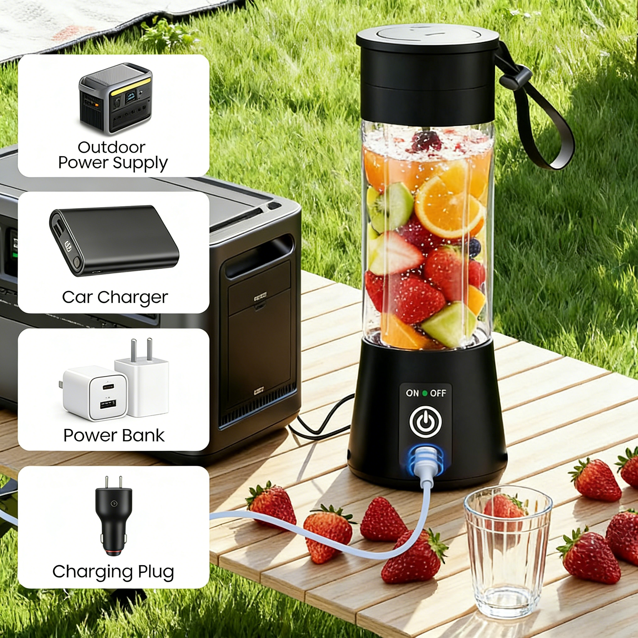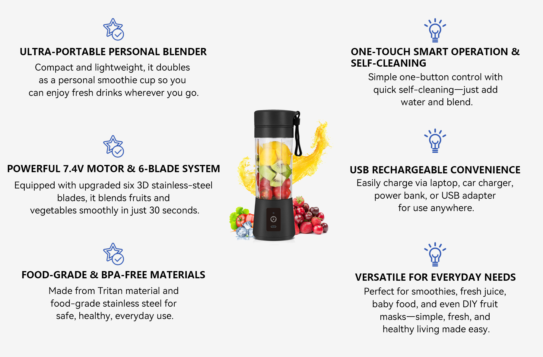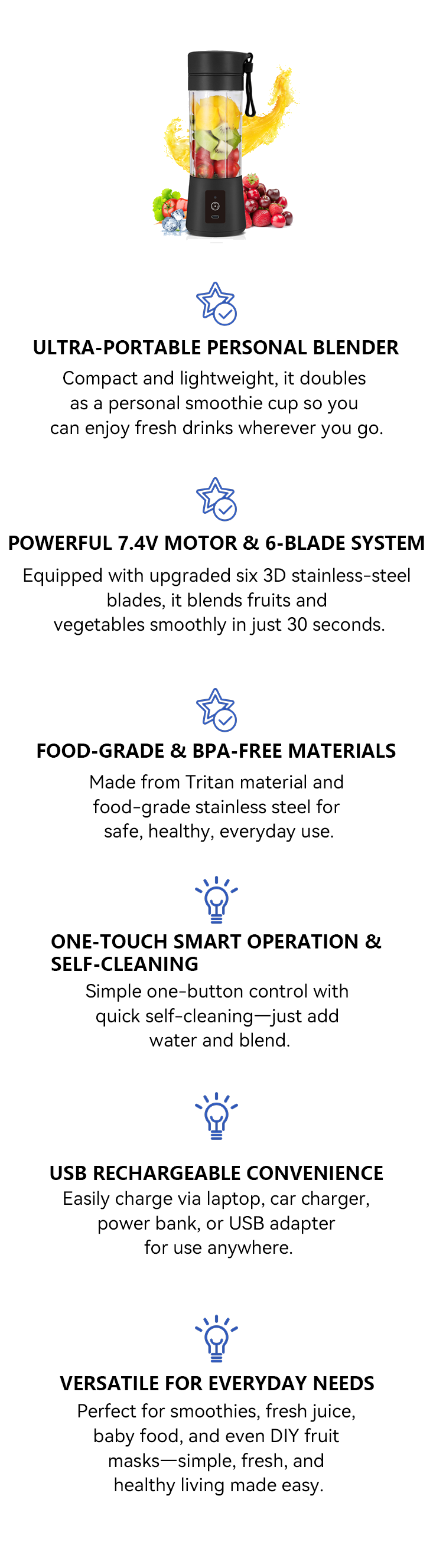 • Powerful 7.4V Motor – Blends fruits and ice quickly with upgraded performance.
